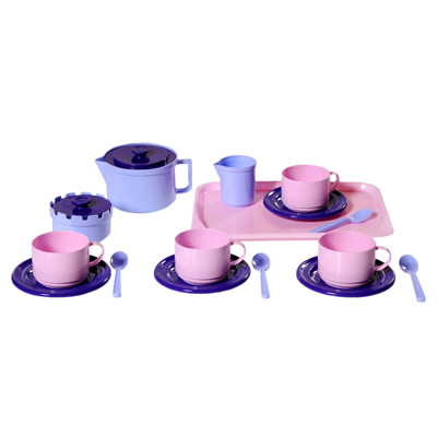 В состав набора входят 4 чашки с блюдцами, 4 чайные ложки, сахарница с крышкой, кофейник с крышкой, молочник и поднос. Набор выполнен из высококлассного пищевого пластика. Допускается использование в микроволновой печи и мытье в посудомоечной машине. Яркие цвета и традиционно качественное литье без облоя и заусенец